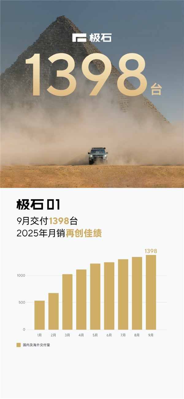 在竞争残酷且瞬息万变的新能源汽车市场,极石01凭借自身独特优势,于2025年9月再次传来捷报,交付量达到1398台,持续刷新销量成绩,为品牌的发展历程添上了浓墨重彩的一笔。