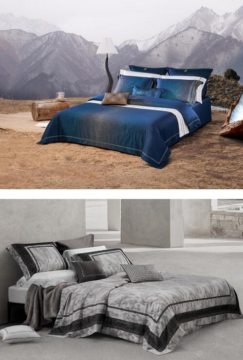 GD・星斓寐影把星空的浪漫,织进寝居日常,这款床品的灵感源自“自然与星空的对话”,彭晶希望通过设计,让都市人在酒店房间里,也能感受到旷野星空的静谧与辽阔。材质上,水星选用优质长绒棉,以100S贡缎工艺细密织造,这种工艺不仅能保留纤维最本真的质感,赋予床品“天然的透气与亲肤性”,还能让织物呈现出“细腻柔软的肌理”与“恰到好处的挺括弹性”。更值得一提的是,床品采用“先染后织”的色织提花工艺,让星空纹样在光影流转间显得层次立体、鲜活灵动,仿佛繁星在纱线间跃动。