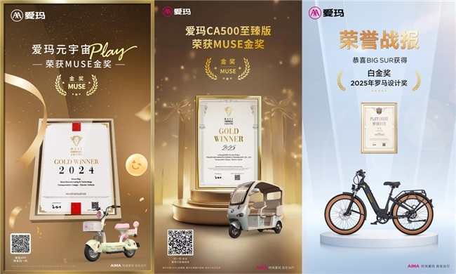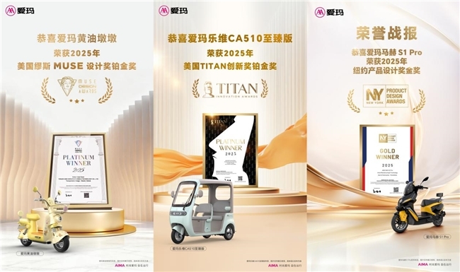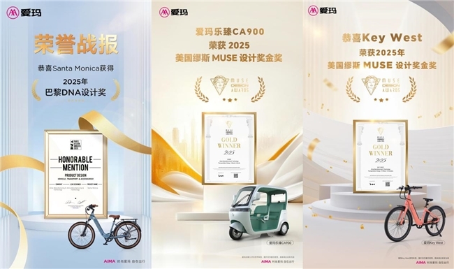 到了第三季度,爱玛电动车更是在国际、国内权威评奖活动中加快了“攻城略地”步伐。爱玛Santa Monica获得2025巴黎DNA设计奖;爱玛黄油墩墩电动车获2025年度MUSE Design Awards(缪斯国际设计奖)铂金奖;为北美市场初学者设计的轻量级新品爱玛Key West与爱玛乐臻CA900休闲电三轮获得2025年度MUSE Design Awards(缪斯国际设计奖)金奖;爱玛乐维CA510休闲电三轮获2025美国TITAN创新奖金奖;爱玛马赫S1pro获2025NY Product Design Awards(纽约产品设计奖)金奖.........