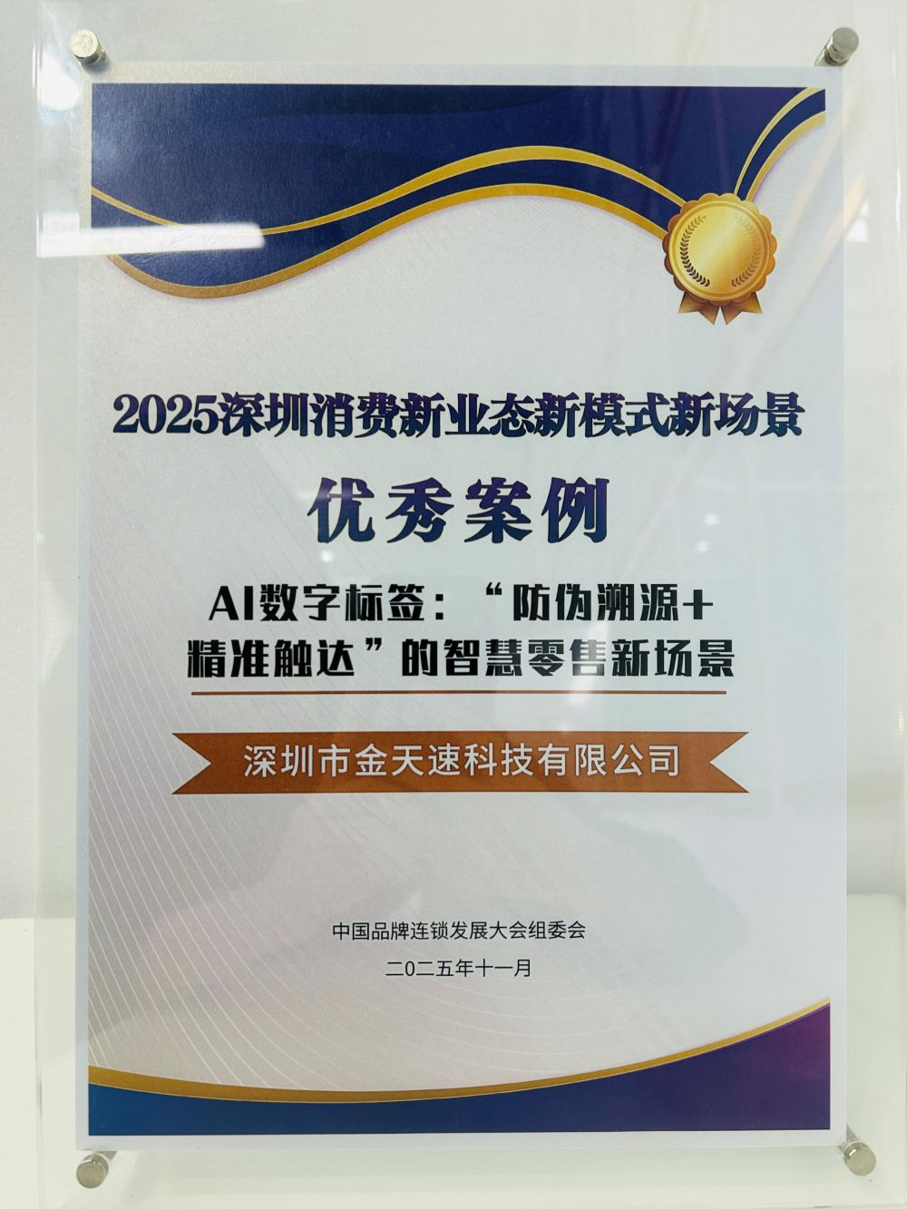 近日,第十二届中国品牌连锁发展大会在深圳福田成功举行,专注于数字化防伪溯源的企业——金天速凭借创新解决方案在品牌连锁行业的实施应用,荣获了“2025年度深圳消费新业态新模式新场景优秀案例”称号。