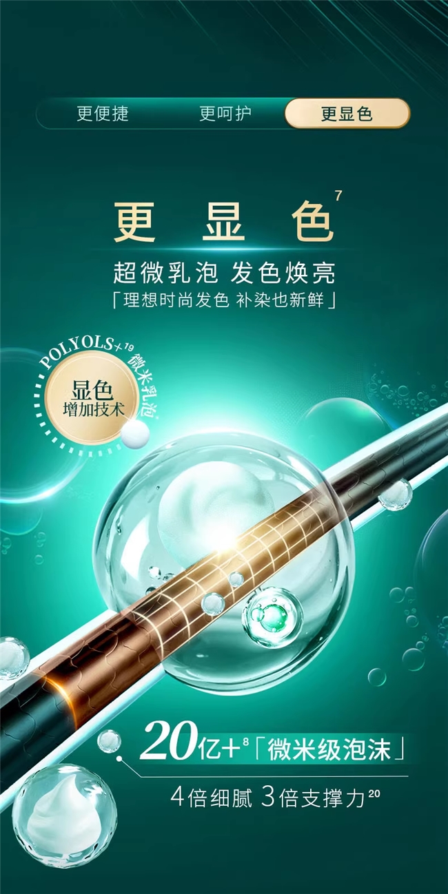 使用体验:采用专利阀门真空气雾剂和高能密闭仓设计,1按即染,无需混合。挤出来就是超微乳泡,拥有20亿+微米级泡沫,比传统膏体细腻4倍,支撑力和包裹性更强,能确保发丝均匀上色,致力还原“卖家秀”。