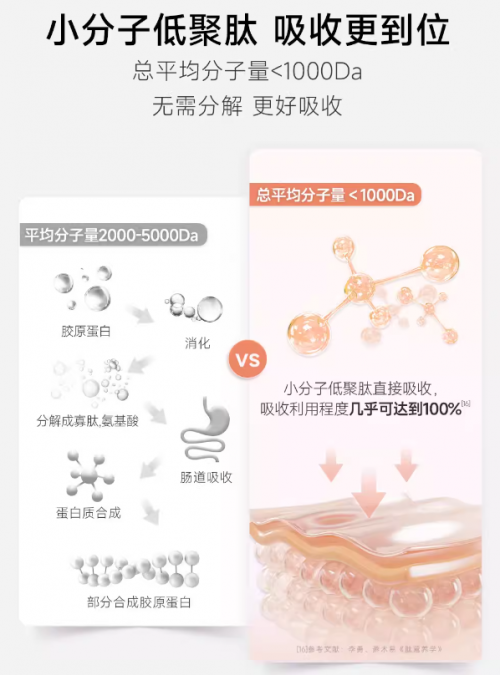 五个女博士产品采用的小分子胶原蛋白肽具有低于1000道尔顿的精准分子量。这种精细的分子结构设计使其能够直接通过肠道被高效吸收,进入人体循环系统,从而更好地作用于皮肤组织。小分子结构不仅提升了生物利用度,还能更快速地被人体利用,实现从内而外的养护效果。