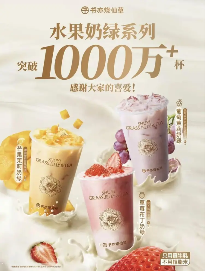 “大橘”的亮眼表现,是书亦“水果有料奶茶”战略成果的缩影。自2025年下半年起,品牌将时令鲜果作为奶茶小料,搭配牛乳与绿茶基底,推出微创新的“水果奶绿系列”,延续早期烧仙草“真材实料、优质平价”的基因,为消费者提供有满足感的高性价比选择。9月上市的葡萄茉莉奶绿广受好评,随后芒果奶绿、草莓布丁奶绿陆续登场,其中草莓布丁奶绿长期稳居销量榜第二,高峰期逼近经典烧仙草。此次大橘奶绿作为可做热饮的水果鲜奶茶,进一步拓宽饮用场景,市场表现强劲。