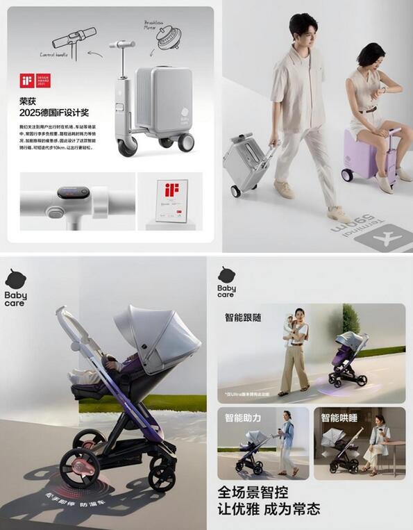除了居家场景,Babycare还将智能化引入了出行场景。其推出的电动行李箱兼具两档调速,集合智能化操作把手,已获2025德国IF设计奖,上市首周就登上天猫“超级88”期间儿童行李箱热卖榜第一;而婴儿推车的智能化优化,则主要聚焦于智能跟随、智能助力、智能感应刹停等性能提升,即使是一个人带娃出门也能从容应对,以科技让家庭出行既轻松又安心。
