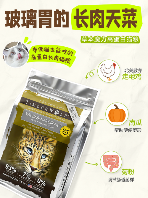 营养数据更是堪称“进口粮卷王”:粗蛋白实测≥50%,碳水化合物含量低于10%,是市面上碳水含量极低的猫粮之一,营养水平接近生骨肉,能让猫咪摄入的营养精准转化为肌肉,而非脂肪堆积导致的虚胖。同时配方0谷物添加,搭配菊粉、干菠菜、苹果、蓝莓等天然成分,既能补充膳食纤维,调节肠道,又能提供天然维生素,减少肠胃刺激,长肉又低敏。