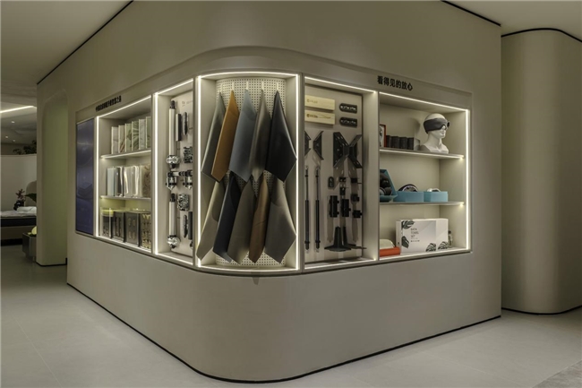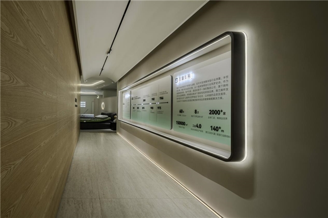“承”幕中,空间与品牌开始相互构建。从产品展示区到品牌历史长廊,再到核心科技区,参观者在动线推进中逐渐触摸到雅兰的品牌脉络。顶部线条引导光线流动,矮墙与绿植隔而不断,自然韵律唤醒人们对智慧生活的具体想象。雅兰智能床的五大云感科技与八大睡眠模式,并非孤立的技术参数,而是被嵌入到空间叙事里,成为支撑生活质感的细节。