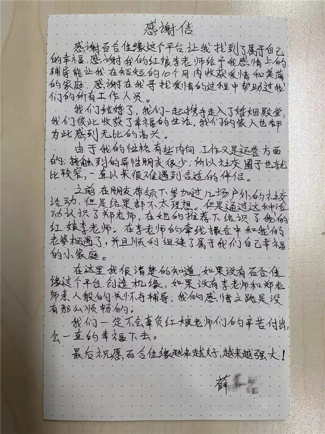 在红娘的对接下,薛先生与李女士开启交往进程。俩人在相处过程中展现出良好的适配性,沟通氛围自然舒适,无需刻意维持交流节奏,能够在各自独立与相互陪伴之间找到平衡。随着交往深入,双方均将彼此纳入未来生活规划,建立起稳定的情感关系,最终于2025年12月12日完成结婚登记手续,正式组建家庭。回想起自己的寻爱之旅,薛先生的眼中满是感激:“正因为世纪佳缘的严把关,我才能如此顺利找到一个如此真诚的伴侣。”为表达对平台与红娘的感谢,薛先生还亲手撰写感谢信,以简洁文字传递对世纪佳缘服务的认可与肯定。这封朴素的感谢信,既是用户对服务成效的肯定,也体现出普通单身群体通过专业服务获得幸福后的真实心声。