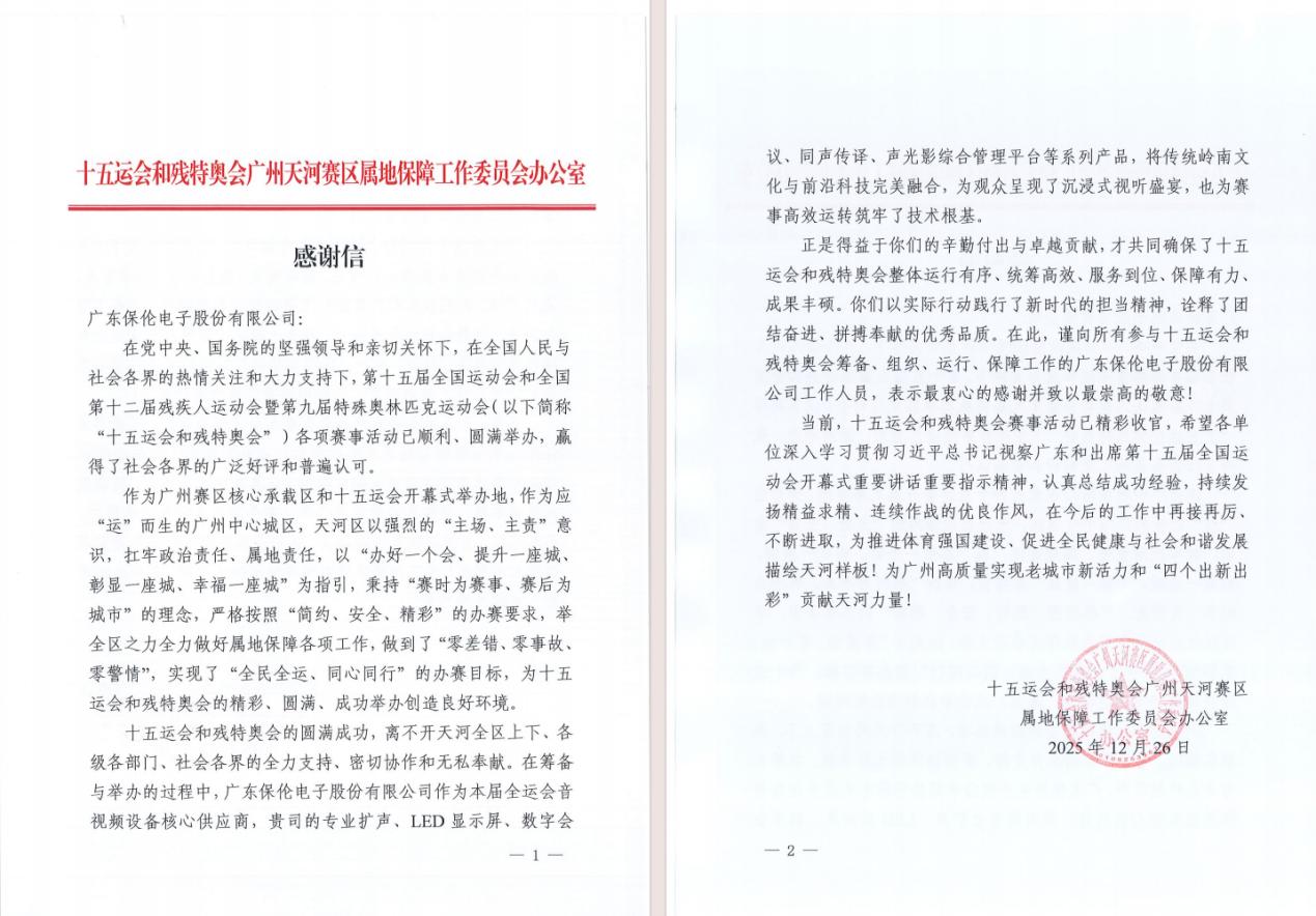 喜报!itc保伦股份收到来自十五运组委会的感谢信