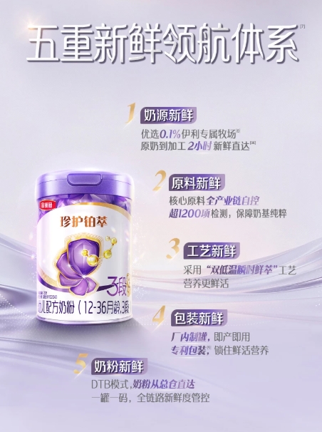 新鲜是奶粉营养的核心保障,珍护铂萃打造的五重新鲜领航体系,实现从源头到终端的全链路新鲜守护,最大程度保留原奶的天然活性营养。